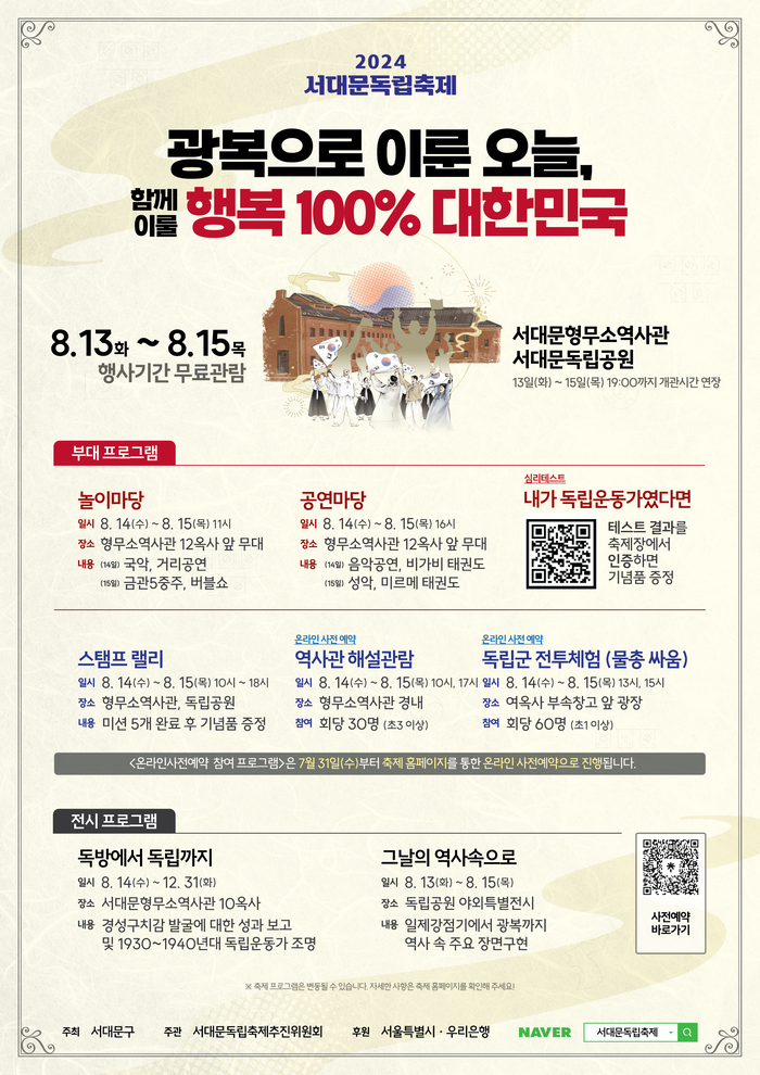 - 2024년 8월 14, 15일 (수-목) 10시/17시👇서대문 독립축제 사전 예약하러 가기(개막공연 마감)👇