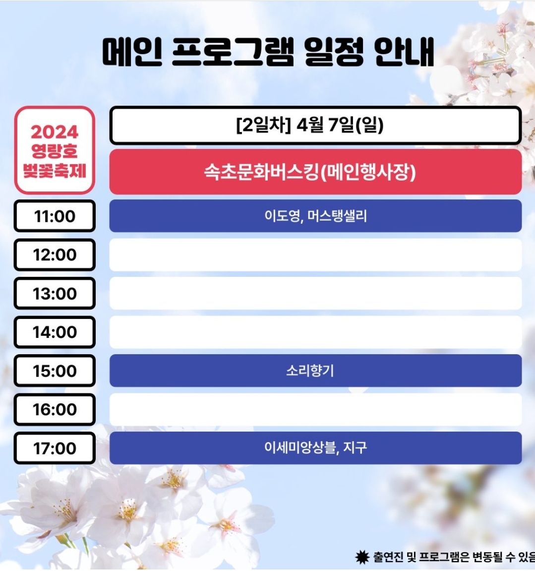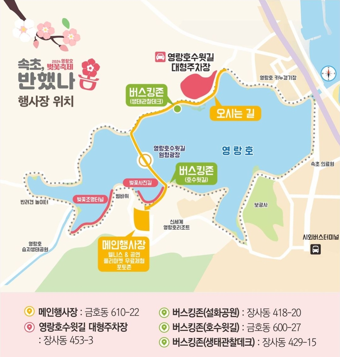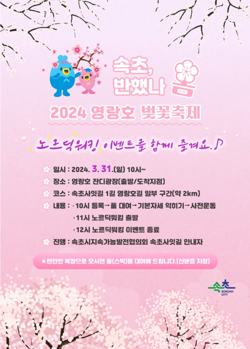 속초시의 벚꽃명소인 영랑호 벚꽃축제가 2024년 3월 30일부터 31일까지 개최하려고 했으나 늦은 벚꽃의 개화 탓에 4월 6일부터 7일까지 축제를 2차례에 걸쳐 진행합니다. 다양한 버스킹 공연과 노르딕 워킹 이벤트가 진행됩니다.
