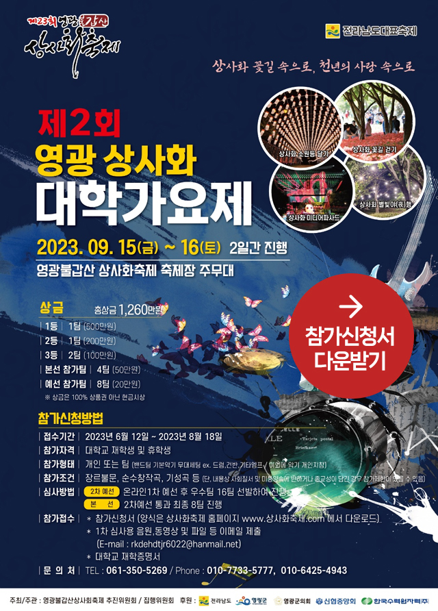 2023년 9월 15일부터 24일까지 가을이면 영광군 불갑산에 상사화(꽃무릇)가 개화합니다. 이 시기에 맞춰 축제가 열립니다. 빨간 꽃이 만개하면 정말 예쁜 곳으로 가요제도 운영되니 관심 있는 분들은 참가신청하시면 됩니다.