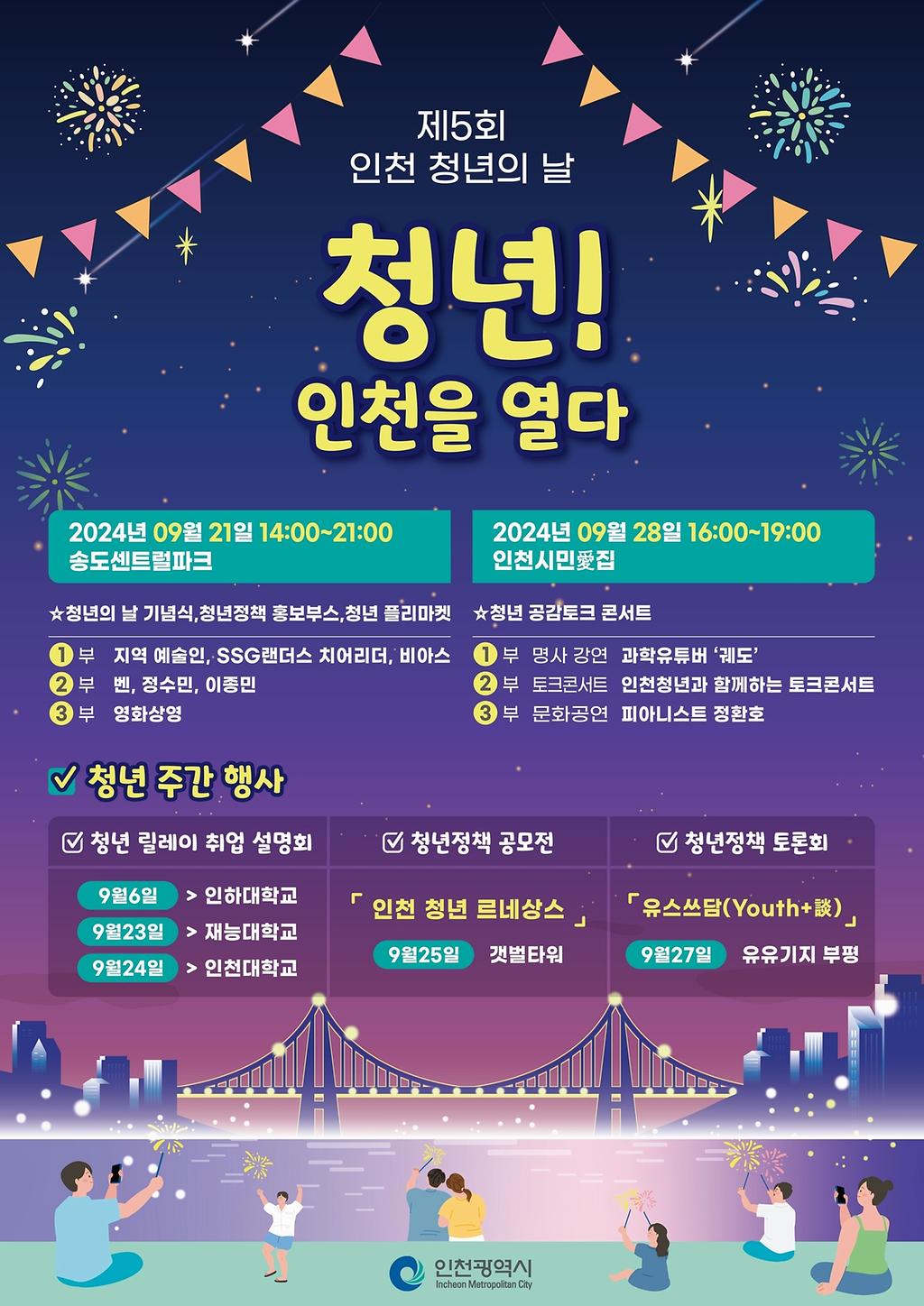 2024년 9월 21일 토요일 인천에서 청소년과 청년을 위한 축제와 행사가 열립니다. 청소년문화대축제와 청년의 날 2가지 행사에 대해 소개해드립니다. 다양한 체험 프로그램이 운영되니 주말에 놀러 갈 곳으로 추천드립니다.